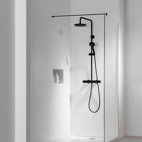 Columna de ducha termostática Roca Victoria-T Basic en acabado negro mate. Tecnología SafeTouch y ahorro de agua. Disponible en Grupo Inpescasa, Fuerteventura.