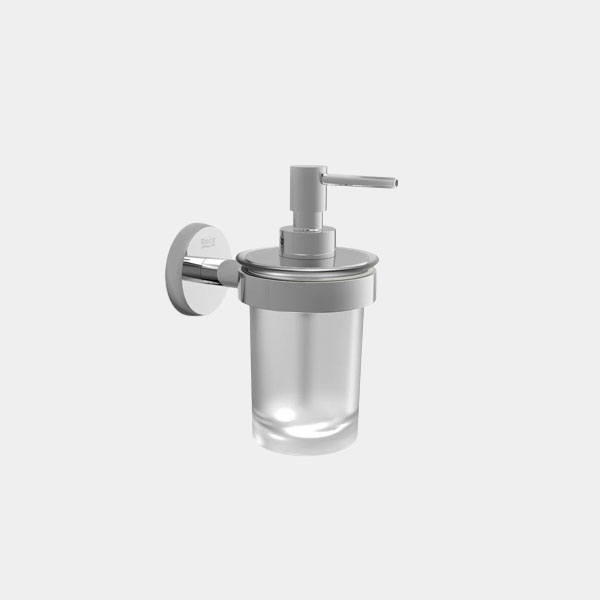 Moderniza tu lavabo con el dosificador de pared Twin de Roca en cromo brillo. Diseño minimalista que ahorra espacio. Disponible en Fuerteventura. ¡Cómpralo ahora!