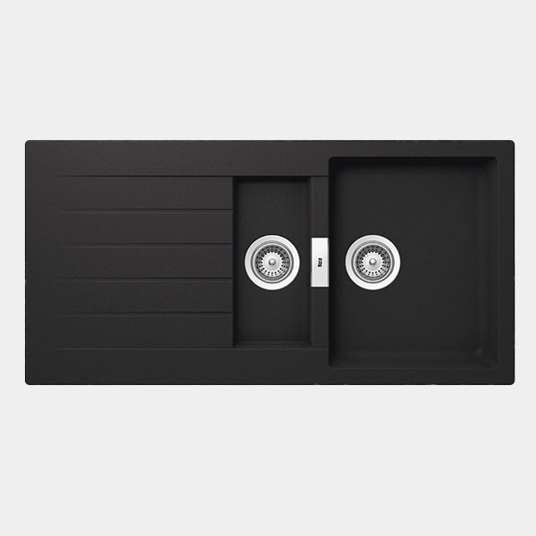 Fregadero de doble cubeta Roca Oslo 100 en color Negro. Fabricado en Quarzex® para máxima resistencia a golpes y calor. ¡Calidad y espacio en tu cocina en Inpescasa!